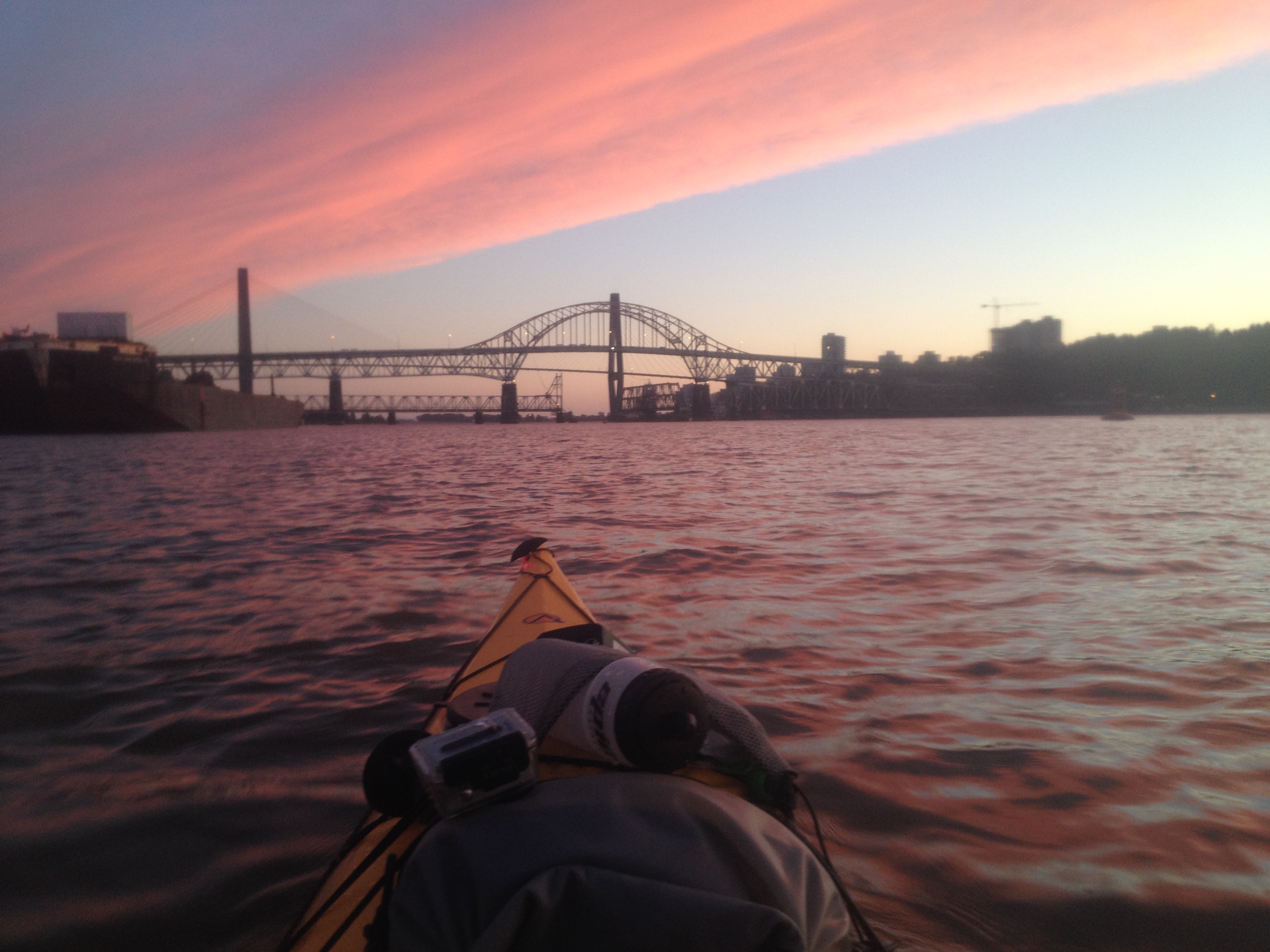 I left the house at 5am yesterday and returned home just before midnight, having paddled 140km from Hope to Burnaby without exiting my kayak. Our goal was to make it all the way to Vancouver, but what we thought would be a 120km paddle turned into more, and after 13 hours on the water we found ourselves navigating under bridges, past barges and avoiding tug boats pulling log booms in complete darkness.